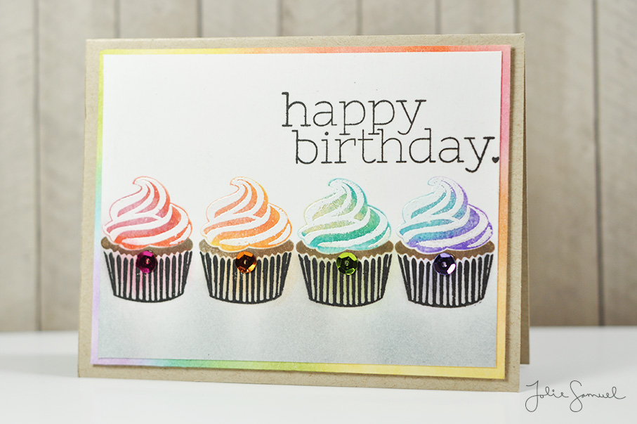I’m back with another technique in rainbow card making to share with you. For this card, I used stamps to create a rainbow effect on the cupcakes. If you look carefully at the icing on the cupcakes you’ll notice that there is a gradient of colors to each one. The first has reds and oranges, the second has orange and yellow, the third has yellow and green, and the last one has blue and purple. The stamps were first pressed into the lighter shade and rolled into the darker shade to create a seamless blending.