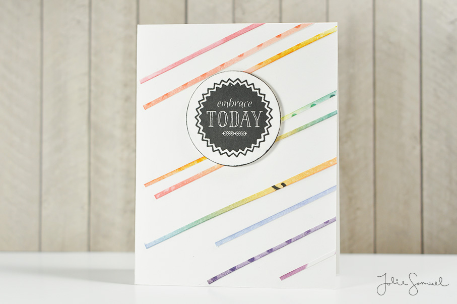 I grabbed a piece of white cardstock and laid out the stripes and found that they once again created their own rainbow in a sense. I decided to create a card using them and here’s it is!