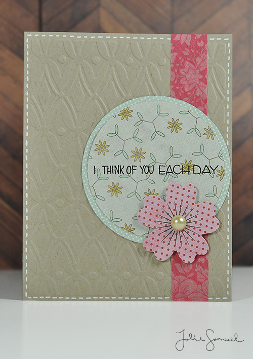 For today’s Feminine card I wanted to create a cards using “Thinking of you” as a sentiment and products that would stretch to both of projects. For both cards I used Embossing folders, washi tape, my circle cutter and papers from My Minds Eye.
